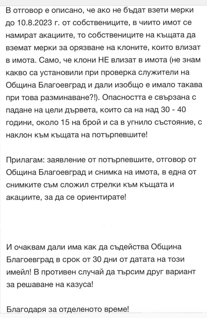 Случаят се протакаше с години, като на заявленията и документите на собствениците на имота не се обърна внимание (заключението беше: частен имот), докато не се намесихме ние с въпроси свързани с рисковете от тези дървета и поставянето на срокове за решаване на този проблем!