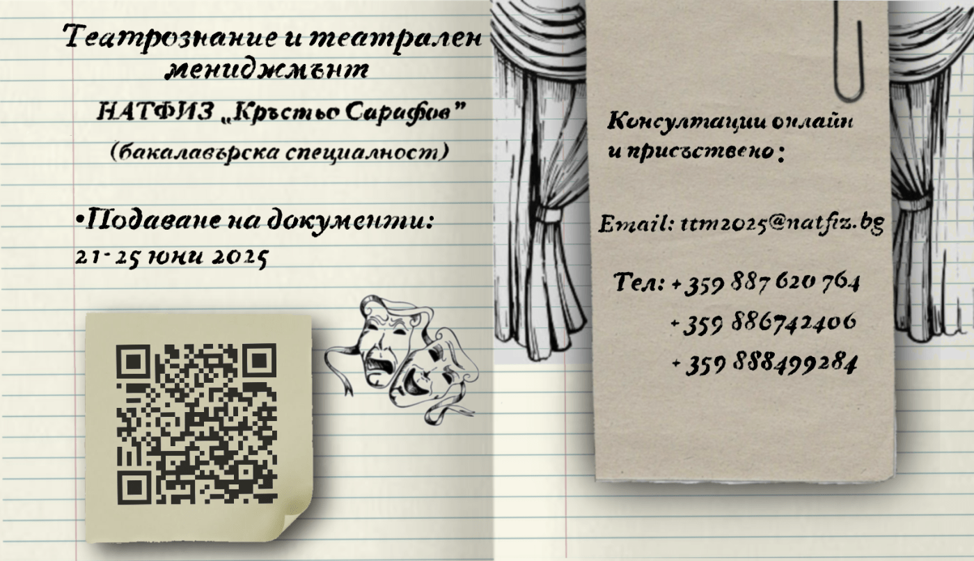 От 21 до 25 юни 2025 г. започва подаването на документи за кандидатстване за специалност „Театрознание и театрален мениджмънт“ в НАТФИЗ ,,Кръстьо Сарафов“. Кандидатстудентските изпити са от 1 – 10 юли 2025 г. (линк към специалността: https://natfiz.bg/teatroznanie-i-teatralen-menidzhmant/ ).
