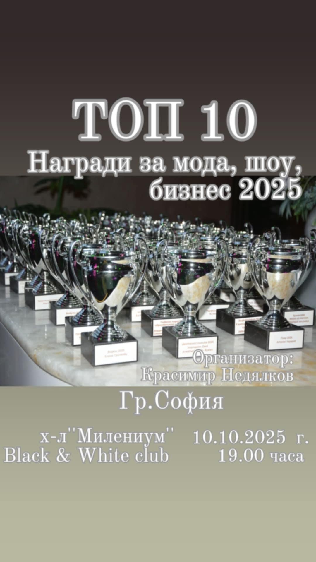 София отново ще бъде сцена на блясък, признание и класа с 31-вото издание на престижните Топ 10 награди за мода, шоу и бизнес. Събитието събира изявени личности от модната, културната и бизнес среда в България и се организира традиционно от Красимир Недялков – дизайнер, шоумен, попизпълнител и емблематичен организатор на елитни събития.