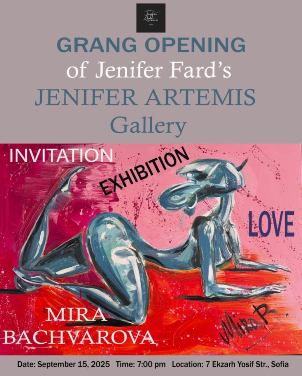 В сърцето на столицата, където изкуството и духът на съвременната култура пулсират най-силно, се открива новият културен оазис галерия „Дженифер Артемис“ – проект на артистичната Дженифер Фард, който обещава да бъде арена за среща на авангардни творци и смели идеи.