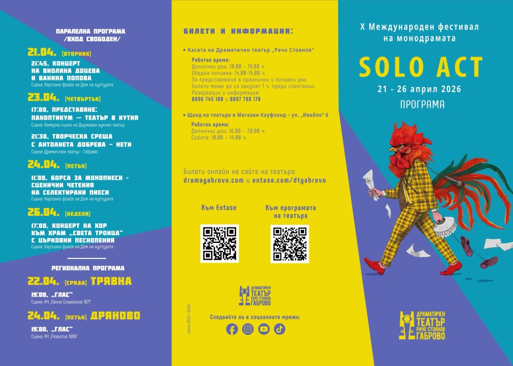 От 21 до 26 април 2026 г. в Габрово предстои десетото мащабно издание на Международния фестивал на монодрамата „Соло Акт“. Фестивалът, организиран от Драматичен театър „Рачо Стоянов“, се провежда на всеки две години, като от 2024 г. има и регионален характер.