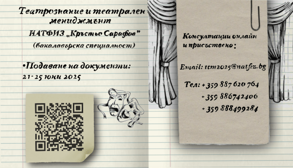 НАЦИОНАЛНА АКАДЕМИЯ ЗА ТЕАТРАЛНО И ФИЛМОВО ИЗКУСТВО „КРЪСТЬО САРАФОВ” ТЕАТРОЗНАНИЕ И ТЕАТРАЛЕН МЕНИДЖМЪНТ Специалността „Театрознание и театрален мениджмънт“ създава успешни арт мениджъри, които притежават необходимите професионални компетентности и инструменти за управление и създаване на културни политики в областта на сценичните изкуства. От 21 до 25 юни 2025 г. започва подаването на документи за кандидатстване за специалност „Театрознание... Continue Reading →