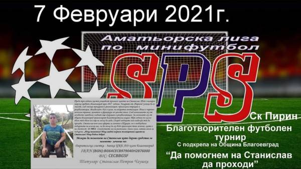 Amatiorska Liga Sps със подкрепата на Община Благоевград организира благотворителен футболен турнир за набиране на средства за Станислав. Дата на провеждане: 7 Февруари 2021 г. Място: Футболен терен на СК Пирин Минимална такса за участие: 50лв Записване до: 5 Февруари 2021г. Нека заедно да помогнем на Станислав да проходи. Всички средства събрани от турнира, ще... Continue Reading →